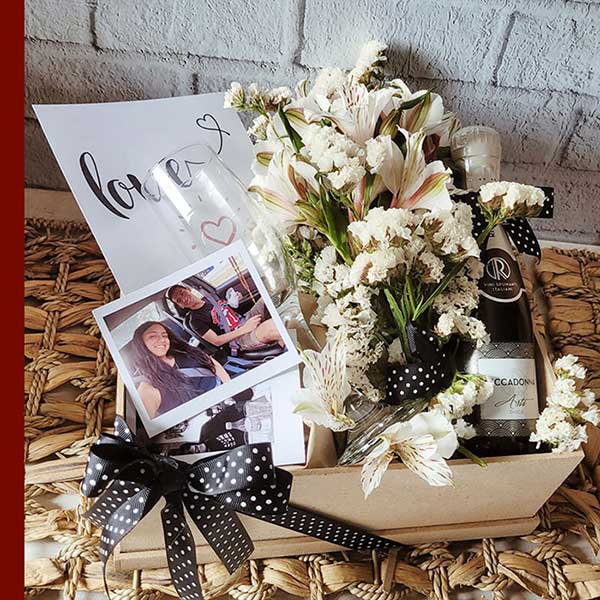 Un detalle elegante para brindar en grande. Incluye una botella personal de Riccadonna, copa de vidrio, un delicado ramito de astromelias, foto especial, bandeja decorada y tarjeta XL para tu mensaje. Todo listo en un empaque pensado para sorprender y celebrar los mejores momentos.